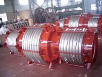 該膨脹節(jié)的二端各有一個工作波紋管,中間有一個平衡波紋管,膨脹節(jié)通過受力構件(大拉桿或舌管)來承受內(nèi)壓推力,因此管系只需中間固定支架。該膨脹節(jié)只能吸收軸向位移。