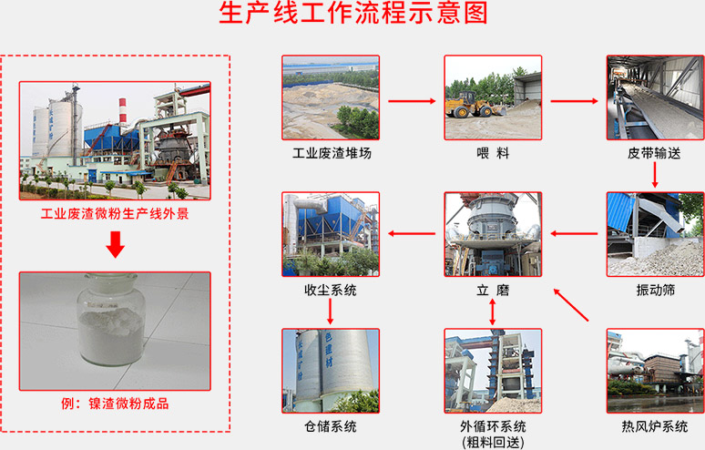 【工藝流程】堆放著的工業(yè)廢渣由鏟車取料、喂料,通過皮帶機(jī)進(jìn)行輸送。在輸送過程中,工業(yè)廢渣原料先后經(jīng)由除鐵器和振動(dòng)篩得到除鐵和篩分,然后通過稱重設(shè)備倉、提升機(jī)進(jìn)入立磨機(jī)進(jìn)行粉磨。粉磨后的工業(yè)廢渣借助熱風(fēng)爐提供的熱風(fēng),通過選粉機(jī)進(jìn)行選粉,同時(shí)得到烘干。符合細(xì)度要求的工業(yè)廢渣微粉最后被輸送到收塵器收集、盛放后,由空氣輸送斜槽、提升機(jī)進(jìn)入成品庫中儲(chǔ)存。